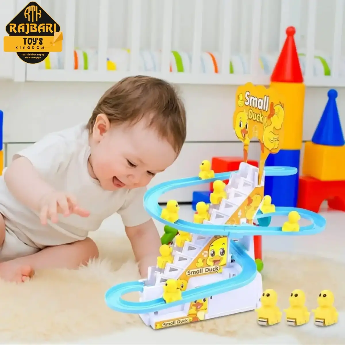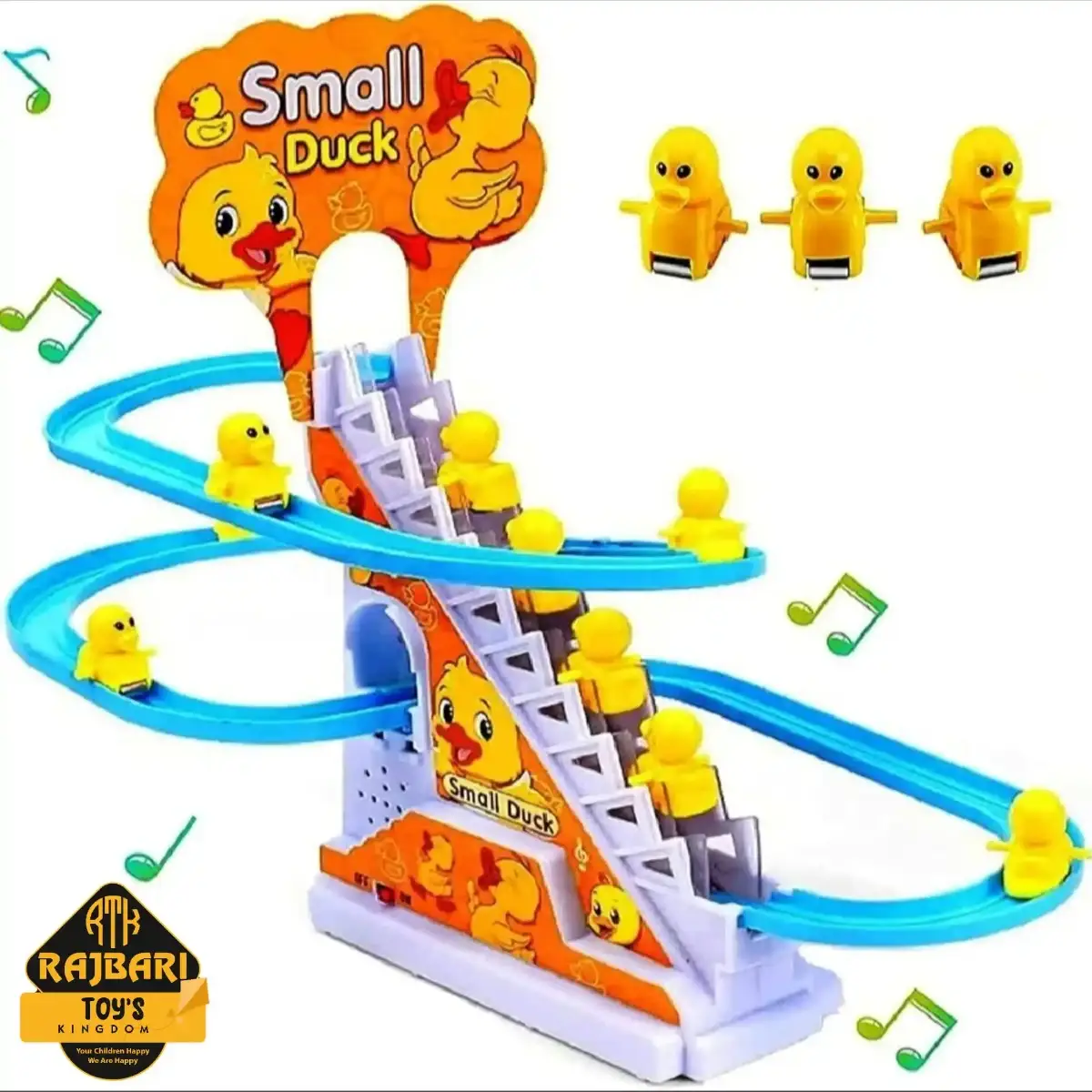 #Unique Design:The toy set comes with flashing LED lights, and it is easy to assemble. The cute little yellow ducks can climb stairs and slide tracks. The toy contains interesting tracks and cheerful music (with on/off button).