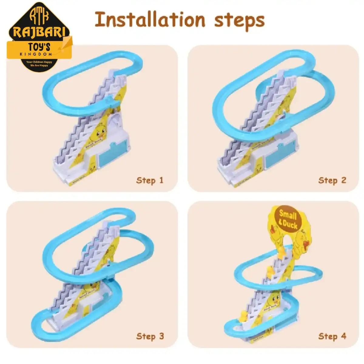 #Internal Items:The product includes 9 cute little yellow ducks, 3 pieces of roller coaster track, 1 track base, 1 arch card board and 1 battery-powered musical escalator. (Need to prepare 2 AA batteries yourself)